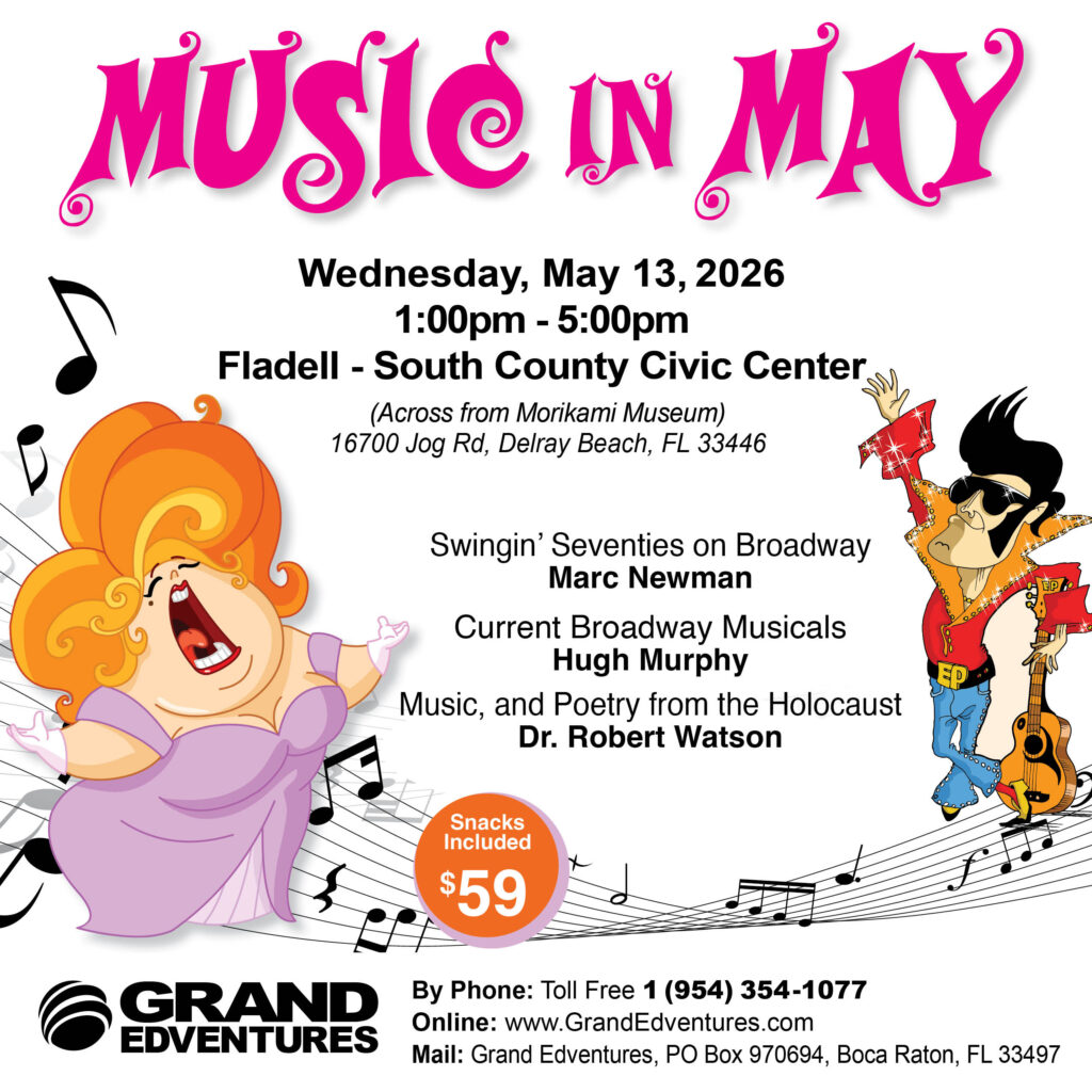 Wednesday May 13, 2026 Fladell South County Civic Center 16700 Jog Road, Delray Beach Across from Morikami Museuem $59